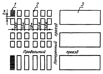 1.5. Группы штабелей отделяются между собой продольными проездами шириной не менее 10 м и поперечными разрывами или проездами шириной не менее 5 м, одинаковыми по ширине на всем протяжении.