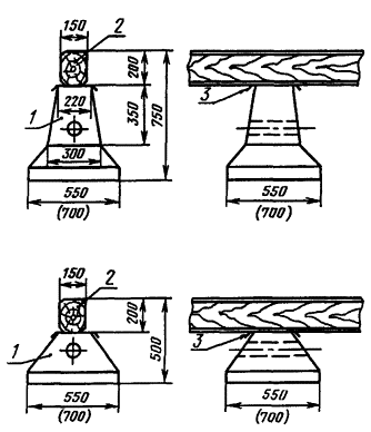 Схемы фундаментов для укладки пакетных штабелей автопогрузчиком и кранами приведены на черт. 4, а размеры переносных железобетонных опор и прогонов на черт. 5.