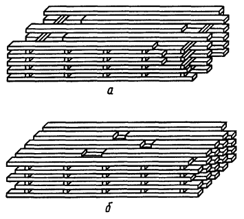 а - вразбежку; б - со стыковкой коротких пиломатериалов по длине