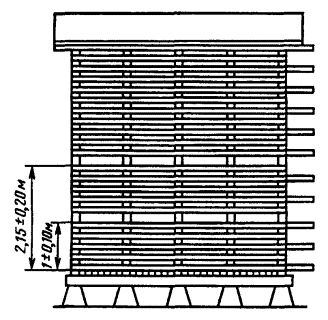Кроме вертикального канала в рядовых штабелях должны быть устроены горизонтальные каналы шириной не менее 150 мм на высоте 1,00±0,10 и 2,15±0,20 м от нижнего ряда пиломатериалов (черт. 9).