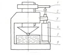 1-пластина; 2- пуансон; 3-корпус; 4- индикатор; 5-шарик; 6-образец