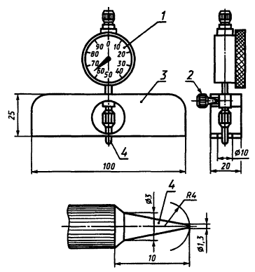 1 - шкала индикатора; 2 - стопорный винт; 3 - колодка; 4 - измерительный наконечник
