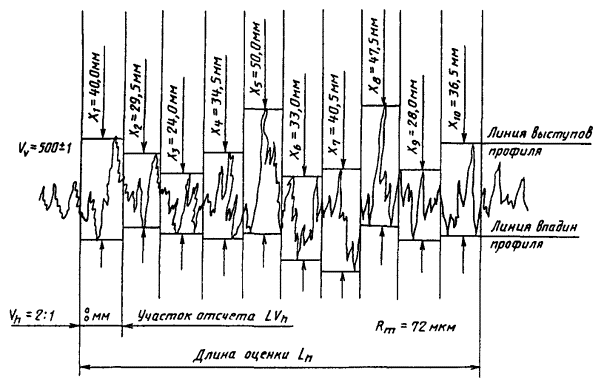 2.4.1. На полученных профилограммах выбирают участки отсчета в количестве по п. 2.2.5 и длиной (Lh), вычисляемой по формуле