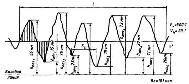 l - базовая длина; hmaxi - расстояние от высшей точки i-го наибольшего выступа до линии, эквидистантной средней и не пересекающей профиль; hmin i - расстояние от низшей точки i-й наибольшей впадины до линии, эквидистантной средней и не пересекающей профиль; Szi - шаг i-й неровности по впадинам; m' - средняя линия профиля