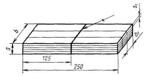 2.2. Заготовку для образцов склеивают специально или выпиливают из готовой продукции в форме прямоугольного бруска с клеевым швом посредине длины заготовки. Длина заготовки должна быть 250 мм. Ширину b и толщину s заготовки принимают в зависимости от необходимого количества образцов.