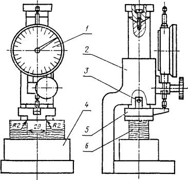 1 - индикатор; 2 - корпус; 3 - шток; 4 - подставка; 5 - съемный пуансон; 6 - образец