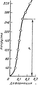 4.1. Для определения нагрузки по результатам измерений вычерчивают диаграмму смятия поперек волокон, подобную изображенной на черт. 2. За нагрузку Р принимают ординату точки перехода прямолинейного или близкого к прямолинейному участка диаграммы в явно криволинейный. Масштаб диаграммы по оси ординат должен быть не менее 50 Н/мм, чтобы обеспечить определение нагрузки Р с погрешностью не более 50 Н.