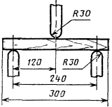 приспособление, обеспечивающее изгиб образца приложением нагрузки к его боковой поверхности в середине расстояния между центрами опор. Радиус закругления опор и нагружающего ножа должен быть 30 мм;