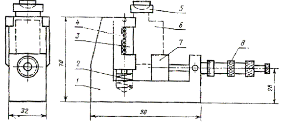 1 - корпус; 2 - пружина; 3 - подвижная планка; 4 - ролики; 5 - нажимная призма с шаровой опорой; 6 - образец; 7 - подвижная опора; 8 - устройство для прижима подвижной опоры