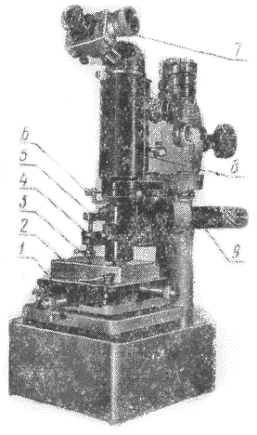 1 - столик; 2 - контрольный образец; 3 - индентор; 4 - груз; 5 - механизм нагружения; 6 - рукоятка; 7 - окулярный микрометр; 8 - измерительный микроскоп; 9 - осветитель.