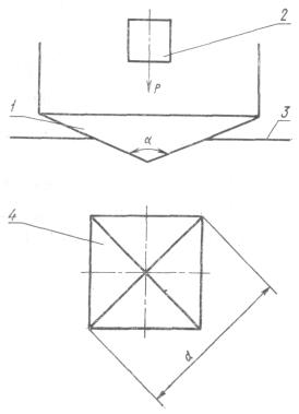1 - индентор (четырехгранная пирамида); 2 - груз; 3 - испытываемый материал; 4 - отпечаток; a - угол между противоположными гранями пирамиды - 136°; d - диагональ отпечатка.