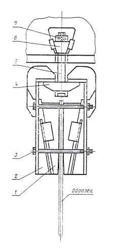 Приспособление (см. справочное приложение 1), состоящее из двух агрегатов, соединенных с нагружающим механизмом машины и передающих усилие на образец с помощью натяга, создаваемого клиновидными губками. Сопрягающиеся с образцом поверхности губок должны иметь рифление и скос, постепенно уменьшающий давление на образец от максимальной величины до нуля (см. справочное приложение 2). Предельное значение шкалы силоизмерителя испытательной машины не должно превышать нагрузку Fраз более чем в 3 раза.