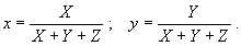 2. Координаты цветности х, y в системе XYZ рассчитывают по формулам
