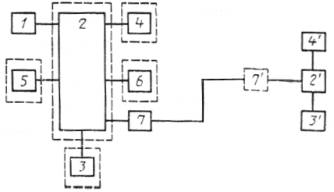 1 - извещатель; 2, 2¢ - установка управления; 2 - охранный (охранно-пожарный) приемно-контрольный прибор, 2¢ - пульт централизованного наблюдения; 3, 3¢ - пульт централизованного наблюдения; 4, 4¢ - световой и (или) звуковой оповещатель; 5 - устройство, управляемое установкой управления; 6 - программируемое входное устройство; 6 - шифрустройство; 7, 7¢ - сигнальный интерфейс (модем); 7, 7¢ - система передачи извещений