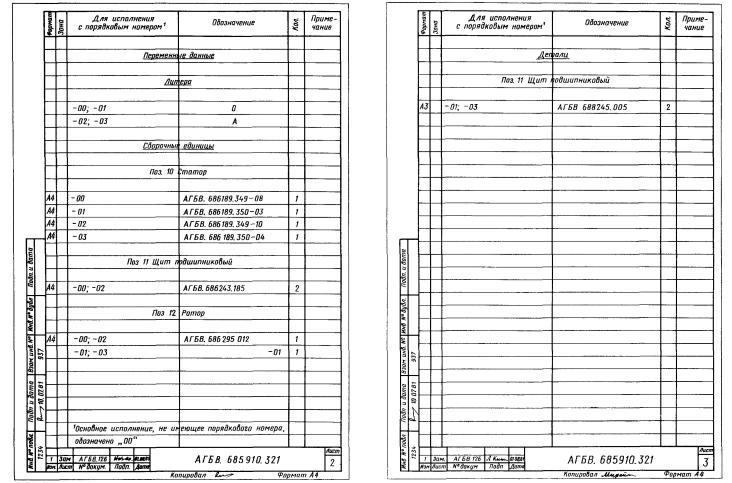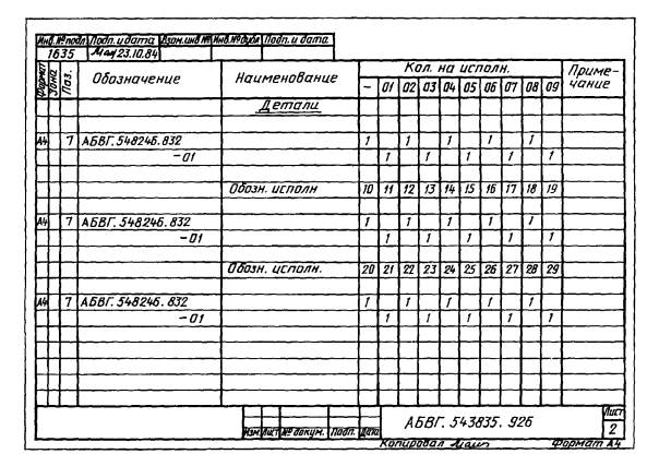 Обозначения исполнений следует записывать в первую графу слева, имеющую заголовок «Обозначение». Запись ведется, как правило, в порядке возрастания обозначений. При записи группы исполнений с одинаковыми базовыми обозначениями полное обозначение следует записывать только для одного исполнения, а в последующих строках - дефис и порядковый номер исполнения (см. приложения 7, 9, 11, 12).