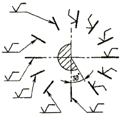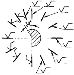 Высота знака условного обозначения направления неровностей должна быть приблизительно равна h. Толщина линий знака должна быть приблизительно равна половине толщины сплошной основной линии.