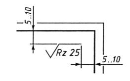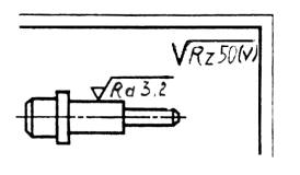 Размеры и толщина линий знака в обозначении шероховатости, вынесенном в правый верхний угол чертежа, должны быть приблизительно в 1,5 раза больше, чем в обозначениях, нанесенных на изображении.