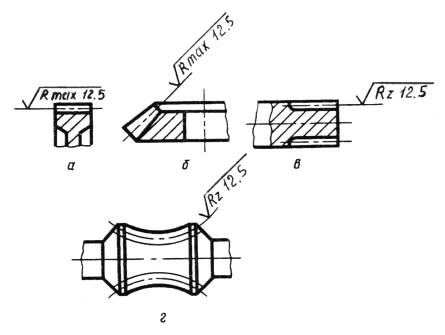 2.10. Обозначение шероховатости рабочих поверхностей зубьев зубчатых колес, эвольвентных шлицев и т. п., если на чертеже не приведен их профиль, условно наносят на линии делительной поверхности (черт. 16а, б, в), а для глобоидных червяков и сопряженных с ними колес - на линии расчетной окружности (черт. 16г).