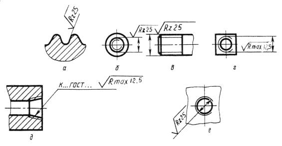 2.11. Обозначение шероховатости поверхности профиля резьбы наносят по общим правилам при изображении профиля (черт. 17а) или условно на выносной линии для указания размера резьбы (черт. 17б, в, г, д), на размерной линии или на ее продолжении (черт. 17е).