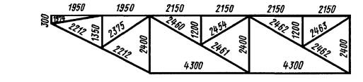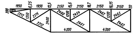 7. В геометрических схемах металлоконструкций размеры расстояний между точками пересечения осевых линий (линий центров тяжести поперечных сечений) стержней наносят над линиями схемы без выносных и размерных линий (черт. 3).