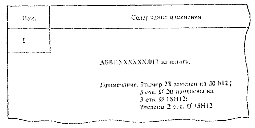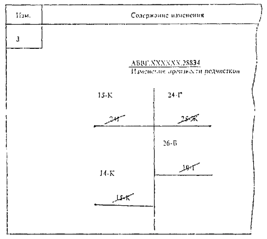 При изменении части изображения его обводят сплошной тонкой линией, образующей замкнутый контур, и крестообразно перечеркивают сплошными тонкими линиями. Измененный участок изображения выполняют на свободном поле документа. Новое изображение измененного участка должно быть выполнено в прежнем масштабе без поворота. Обозначают перечеркнутый и вновь изображенный участки так же как выносные элементы. Над новыми изображениями указывают: «Взамен перечеркнутого».