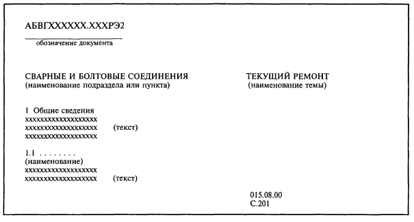 На всех последующих страницах с текстом и иллюстрациями в пределах темы наименования подраздела (пункта) и темы не указывают, а указывают только обозначение документа и номера раздела, подраздела, пункта и страницы по установленной для данного документа форме.