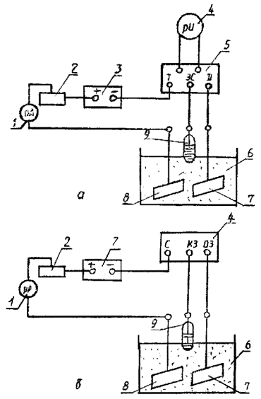 1.5.3. Измерение поляризационного потенциала при помощи вольтметра с прерывателем тока (черт. 9б и черт. 10б) проводят следующим образом: к соответствующим клеммам прибора присоединяют контрольные проводники от трубопровода, датчика и электрода сравнения; включают прибор; через 10 мин после включения прибора измеряют потенциалы через каждые 5 с.