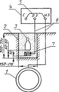 1.4.1. Для проведения измерений по методу 1 стационарный электрод с датчиком потенциала устанавливают на КИП так, чтобы дно корпуса и датчик находились на уровне нижней образующей трубопровода и на расстоянии 50-100 мм от его боковой поверхности, при этом плоскость датчика должна быть перпендикулярна оси трубопровода. Если трубопровод проложен выше уровня промерзания грунтов, то электрод длительного действия устанавливают таким образом, чтобы дно корпуса электрода находилось на 100-150 мм ниже максимальной глубины промерзания грунтов. Перед проведением измерений собирают схему по черт. 9.