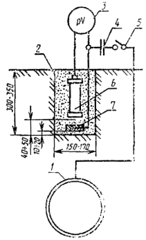 1 - трубопровод; 5 - контрольные проводники; 3 - вольтметр; 4 - прерыватель тока; 5 - труба для установки электрода сравнения; 6 - стальная штанга; 7 - медносульфатный электрод сравнения