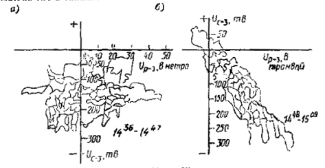 Двухкоординатные регистрограммы записей потенциалов Uс-з и Uр-з метрополитена (а) и трамвая ( б )