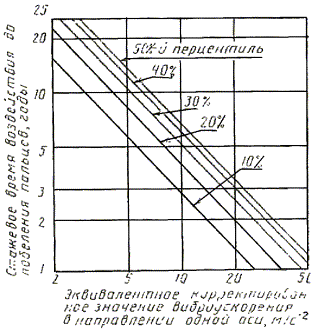 На черт. 6 и в табл. 16 показана зависимость длительности стажевого воздействия вибрации до появления сосудистых расстройств, характеризуемых побелением пальцев, от эквивалентного корректированного значения виброускорения. Сосудистые расстройства легче распознаются, чем другие заболевания кистей и рук, и лучше изучены. Эквивалентное корректированное значение виброускорения рассчитано по преобладающей компоненте вибрации и выражено в м×с-2. Кривые дают стаж в годах до появления случаев эпизодического побеления пальцев у 10, 20, 30, 40, 50 % работающих в условиях регулярного ежедневного воздействия вибрации длительностью 4 ч. Допускается интерполяция между кривыми.