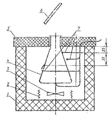 2.7.3. Сущность метода определения температуры тления заключается в термостатировании исследуемого вещества (материала) в реакционном сосуде при обдуве воздухом и визуальной оценке результатов испытания. Изменяя температуру испытания, находят ее минимальное значение, при котором наблюдается тление вещества (материала).