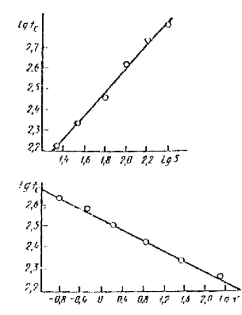 4.1. На основании полученных результатов испытаний строят графики зависимости логарифма температуры самовозгорания от логарифма удельной поверхности и логарифма времени до самовозгорания (черт. 29), которые описываются уравнениями