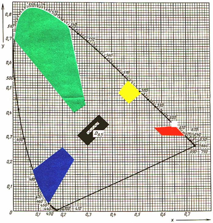 Примечание. Значения, приведенные на цветовом графике и в таблице настоящего приложения, даны для стандартного источника света Д 65 (ГОСТ 7721-76) при освещении поверхности под углом 45° и наблюдении по нормали (геометрии 45°/0°).