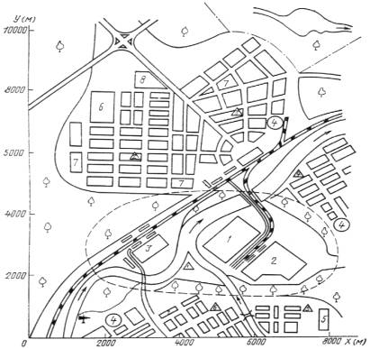 1 - металлургический завод; 2 - азотно-туковый завод; 3 - ГРЭС; 4 - районные отопительные котельные; 5 - цементный завод; 6 - машиностроительный завод; 7 - предприятие легкой промышленности; 8 - домостроительный комбинат.