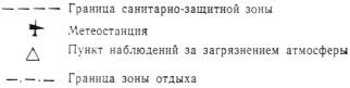 На карту-схему наносятся промплощадки (с основными источниками выброса), санитарно-защитные зоны, существующие жилые кварталы и территории, участки перспективной жилой застройки, зоны отдыха, санатории, дома отдыха, метеостанции, пункты наблюдении за загрязнением атмосферы.
