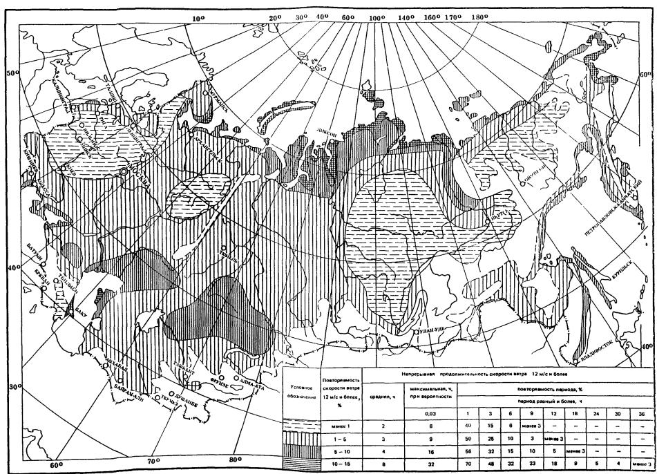 Районирование территории СССР по повторяемости скорости ветра 12 м/с и более за октябрь- апрель