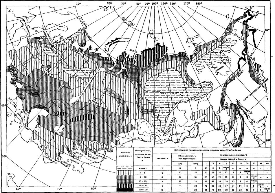 Районирование территории СССР по повторяемости скорости ветра 12 м/с и более за май -сентябрь