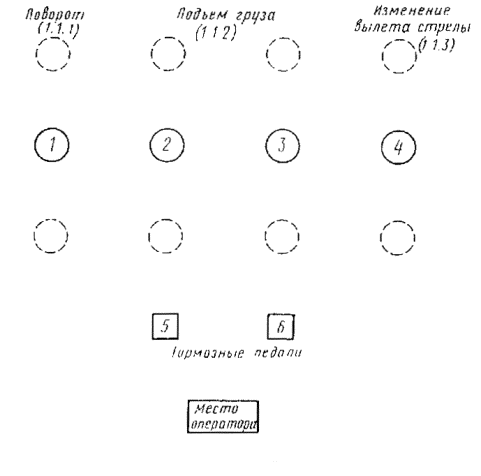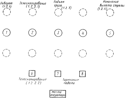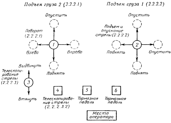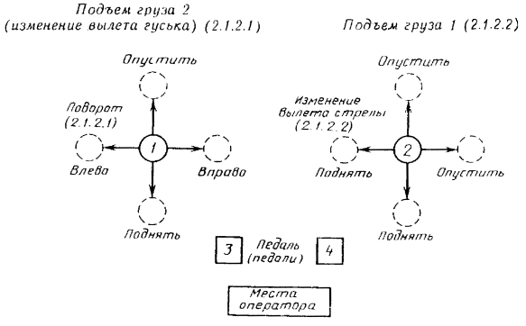 Основные органы управления должны быть расположены как показано на черт. 4. В качестве варианта для изменения вылета стрелы можно использовать педаль (педали) (2.1.2.3).