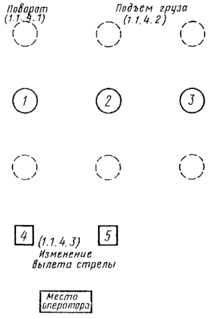1.4.1. Основные органы управления, используемые во время рабочего цикла крана (см. черт. 1-3) должны быть расположены таким образом, чтобы оператор мог легко до них дотягиваться со своего рабочего места.