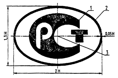 1 - графическое изображение знака соответствия при обязательной сертификации по ГОСТ Р 50460; 2 - овал (эллипс); 3 - центр овала (эллипса)