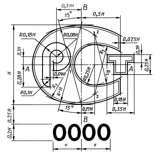 Код органа по сертификации, выдавшего сертификат соответствия, наносят на расстоянии 0,25 Н под графическим изображением знака соответствия по рисунку 5, симметрично относительно вертикальной оси В знака шрифтом, приведенным на рисунке 6, высотой 0,2 Н.