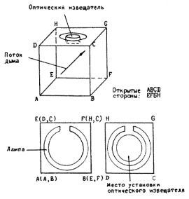 Размеры устройства соответствуют размерам испытательной установки. Устройство имеет форму куба, у которого четыре замкнутые поверхности выложены алюминиевой фольгой с хорошей отражающей способностью, а две противоположные открыты для свободного прохождения дыма (аэрозоля).