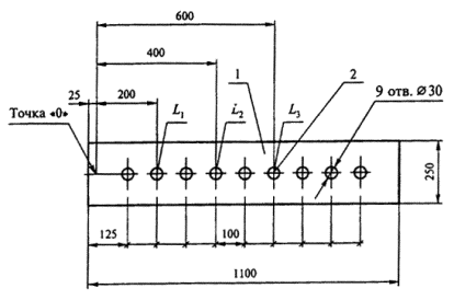 8.2.3 Операции по 8.2.2 повторяют для контрольных точек L1, и l3 (рисунок 4). При соответствии результатов измерений требованиям таблицы 2 проводят измерения ППТП в точках, расположенных на расстоянии 100, 300, 500, 700, 800 и 900 мм от точки «0».