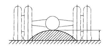 8.3.5 дорожный просвет под одной осью: Расстояние между верхней точкой дуги окружности, проходящей через центры пятен контактов шин одной оси (в случае сдвоенных шин - шин внутренних колес оси) и касающейся самой нижней точки транспортного средства, жестко зафиксированной между колесами, и опорной плоскостью. См. рисунок 5.