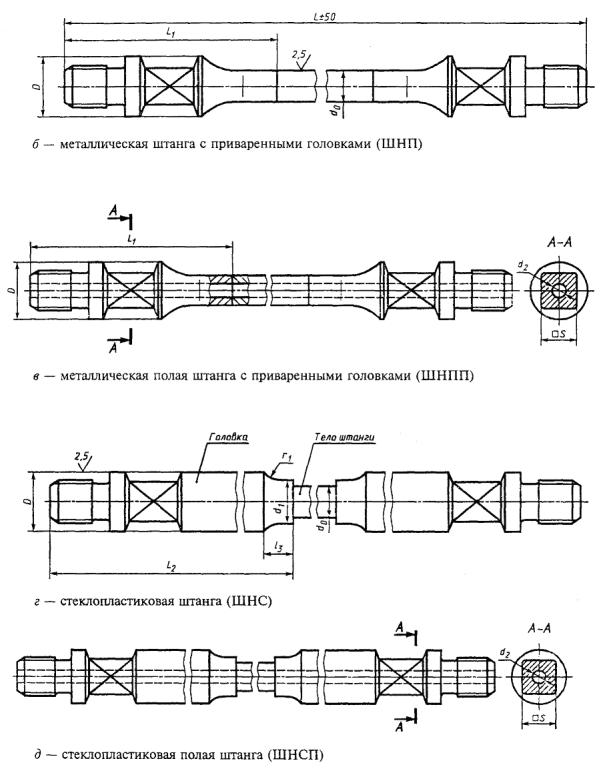 По требованию заказчика штанги с приваренными головками и стеклопластиковые штанги могут изготовляться полыми (рисунки 3в, 3д).