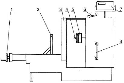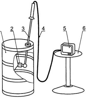 1 - осматриваемая тара; 2 - видеокамера; 3 - рукоятка видеокамеры, 4- соединительный кабель; 5 - монитор (телевизор); 6 - штатив для установки монитора