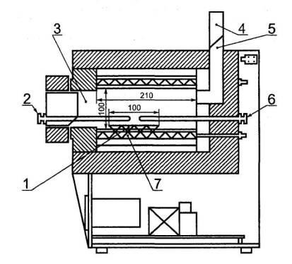 1 - зона постоянной температуры; 2 - контрольная термопара; 3 - камера (ширина 200 мм); 4 - отводная трубка; 5 - клапан; 6 - термопара; 7 - нагревательная система