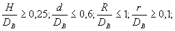 2.2.1.3. Отношение номинальной высоты выпуклой части торо-сферических и тарельчатых крышек и днищ, измеренной от их внутренней поверхности, к номинальному внутреннему диаметру цилиндрической части H/DB должно быть не менее 0,25, а отношение номинального диаметра центрального отверстия, если таковое имеется, к номинальному внутреннему диаметру крышки или днища d/DВ - не более 0,6 (рис. 2). Отношение номинальных радиусов R и r, определяющих форму сферического сегмента и тора, к номинальному внутреннему диаметру цилиндрической части крышки или днища должны составлять соответственно не более 1,0 и не менее 0,1 (рис. 2).