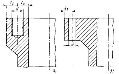 6) при термическом или механическом упрочнении опорной поверхности гайки или торцевой поверхности корпуса витки резьбы в гайке (корпусе) не выводить на опорную поверхность, для чего на опорной поверхности выполнять проточку по диаметру резьбы на глубину не менее толщины упрочненного слоя;